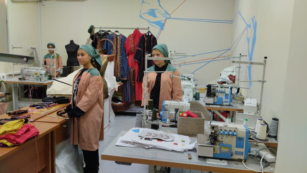 • Tikinçilik bölümi: Bu ýerde Gulnar mugallym dürli ýaşdaky gyzlara we zenanlara geýim tikmek we el işleri boýunça sapak berýär. Taýýar bolan önümler bolsa satylýar.