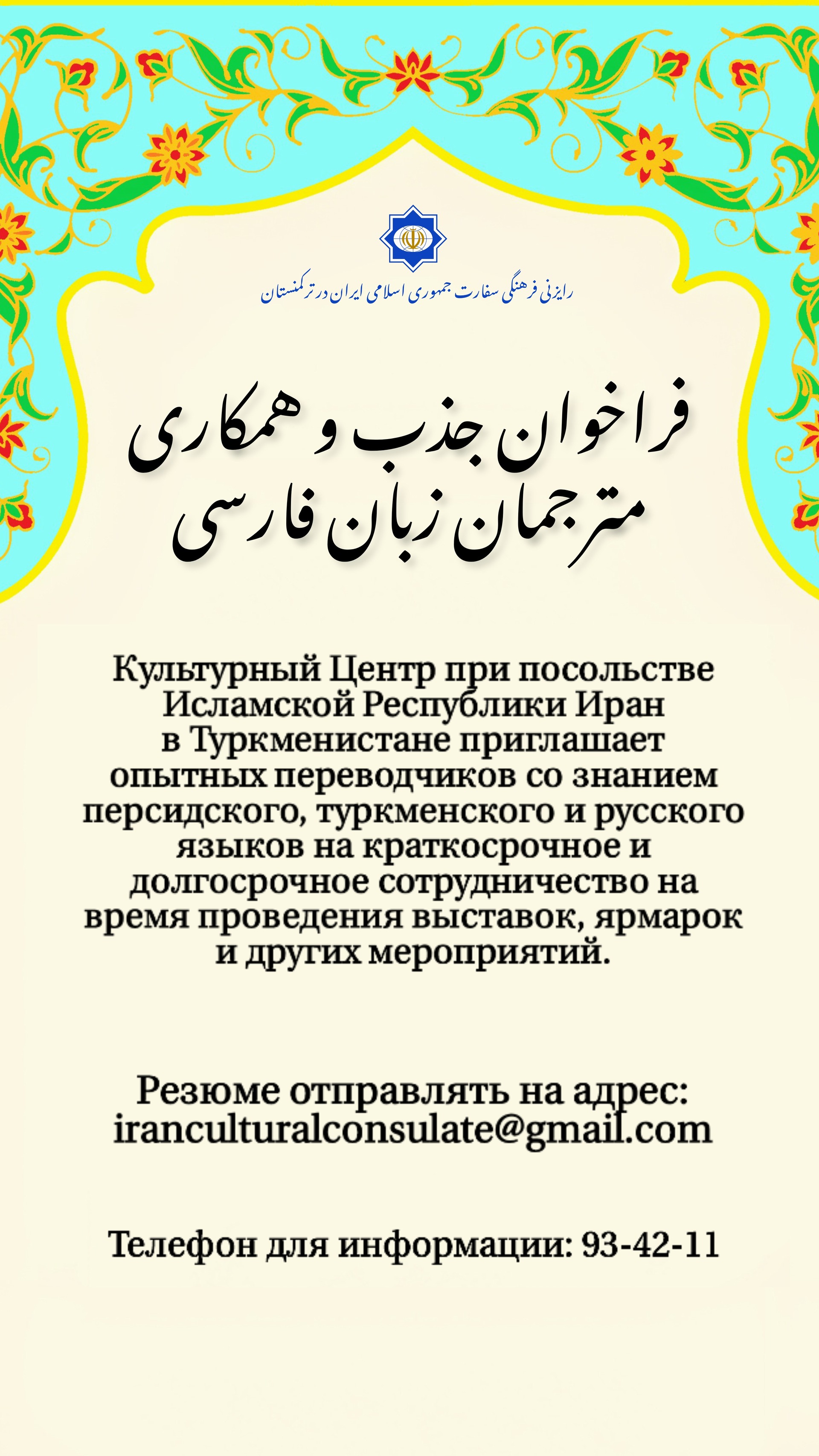 Eýran Yslam Respublikasynyň Türkmenistandaky ilçihanasynyň Medeniýet merkezi Türkmenistanyň çäginde geçiriljek sergilerde we ýarmarkalarda pars dilinden türkmen we rus dillerine hem-de tersine terjime etmegi başarýan ukyply terjimeçileri gysga we uzak wagtlaýyn möhletde hyzmatdaşlyk etmäge çagyrýar.