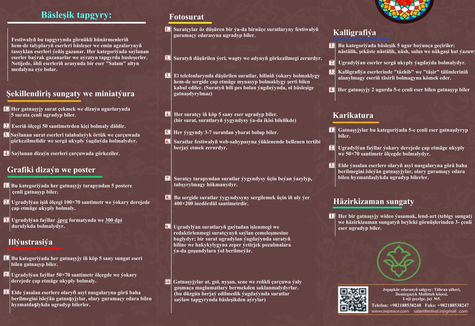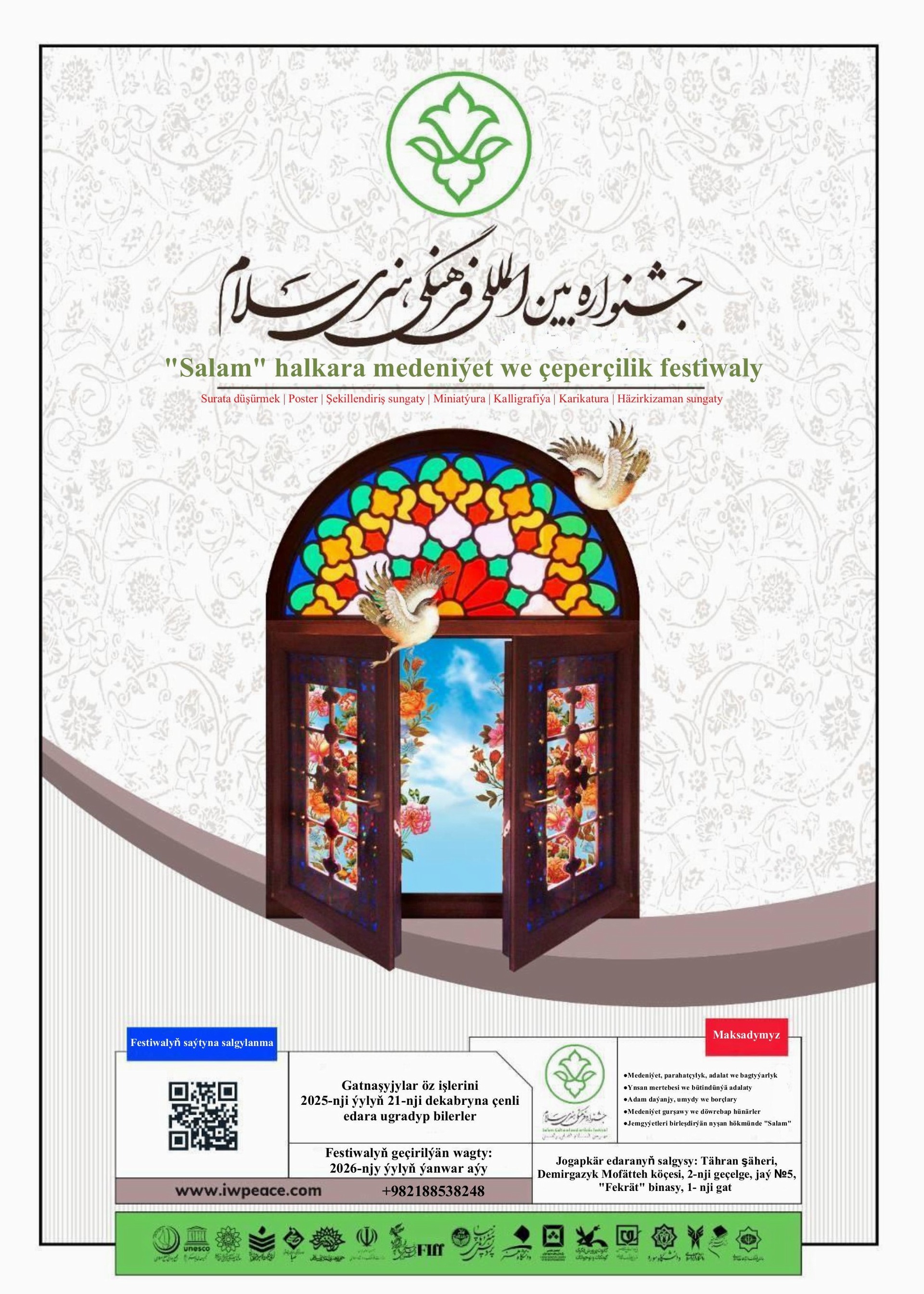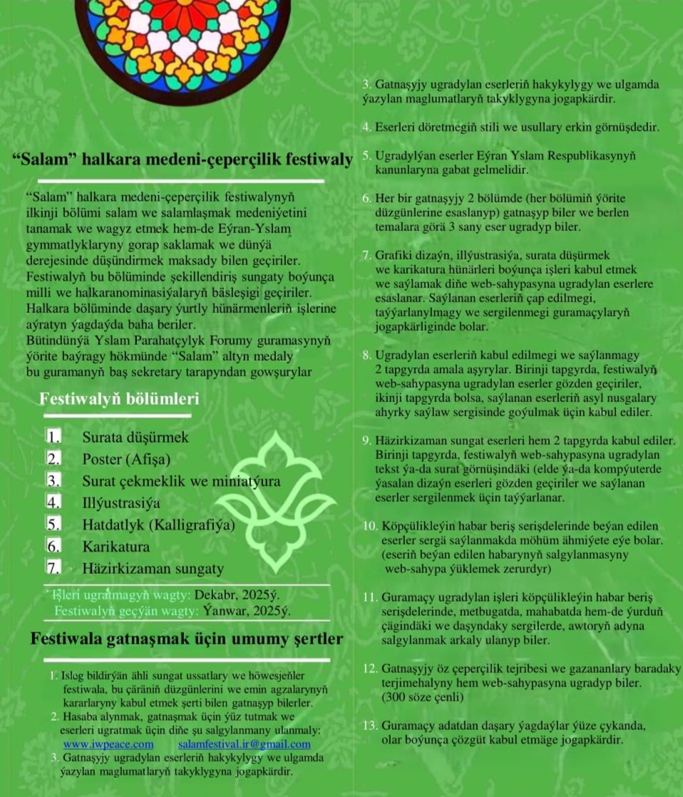 "Salam" halkara medeniýet we çeperçilik festiwaly Surata düşürmek | Poster | Şekillendiriş sungaty | Miniatýura | Kalligrafiýa | Karikatura | Häzirkizaman sungaty Maksadymyz ●Medeniýet, parahatçylyk, adalat we bagtyýarlyk ●Ynsan mertebesi we bütindünýä adalaty ●Adam daýanjy, umydy we borçlary ●Medeniýet gurşawy we döwrebap hünärler ●Jemgyýetleri birleşdirýän nyşan hökmünde "Salam" Jogapkär edaranyň salgysy: Tähran şäheri, Demirgazyk Mofätteh köçesi, 2-nji geçelge, jaý №5, "Fekrät" binasy, 1- nji gat Gatnaşyjylar öz işlerini 2025-nji ýylyň 21-nji dekabryna çenli edara ugradyp bilerler. Festiwalyň geçirilýän wagty: 2026-njy ýylyň ýanwar aýy +982188538248