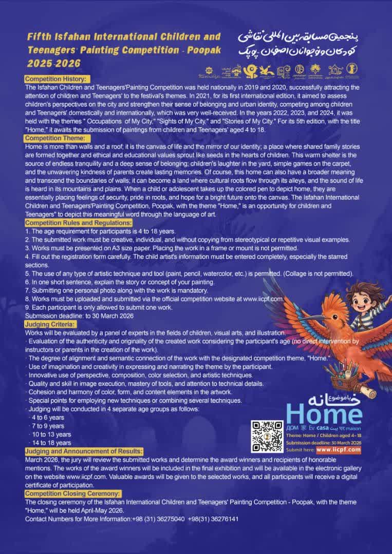 Yspyhanyň "Pupak" atly çagalaryň we ýetginjekleriň suratkeşlik bäsleşigi – 2026 Bäsleşigiň taryhy Yspyhanyň "Pupak" atly çagalaryň we ýetginjekleriň suratkeşlik bäsleşigi 2019-njy we 2020-nji ýyllarda Eyranda milli derejede geçirildi. Bäsleşik 2021-nji ýylda halkara derejesinde geçirildi. 2022-2024 ýý. aralygynda bäsleşik "Şäher hünärleri", "Şäherimiň gözel künjekleri", "Şäherimiň hekaýalary" atly temalar bilen geçirildi. "Öý" temasy bilen geçiriljek bäşinji bäsleşige 4-18 ýaş aralygyndaky çagalaryň we ýetginjekleriň gatnaşmagyna garaşylýar. Bäsleşigiň temasy