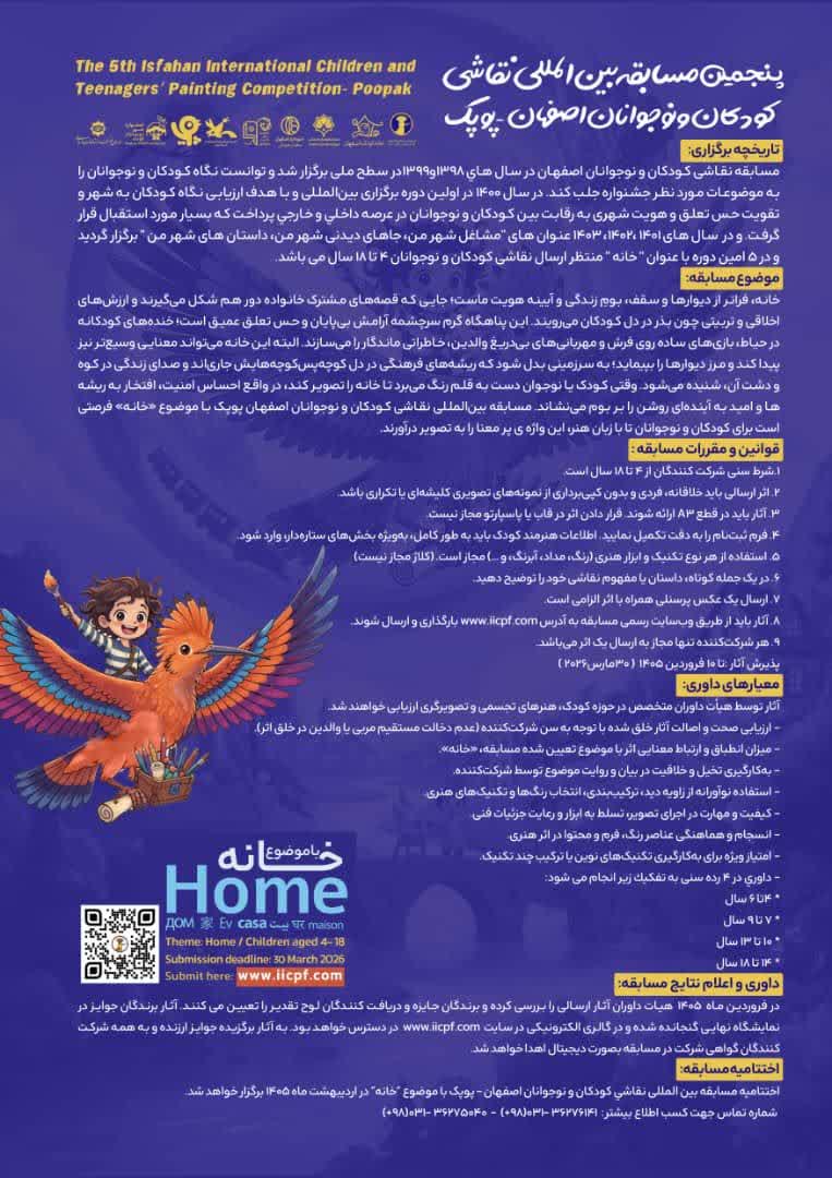 "Öý" temasy bilen geçiriljek Yspyhanyň "Pupak" atly çagalaryň we ýetginjekleriň suratkeşlik bäsleşiginiň ýapylyş dabarasy 2026-njy ýylyň aprel-maý aýlarynda geçiriler.