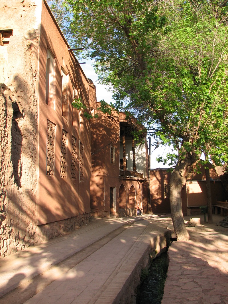 Obanyň gadymylygy Eýran binagärliginiň dürli döwürlerine degişli yzlary we alamatlary görmäge mümkinçilik berýär. Abýanede Sasanylar (III-VII asyrlar), Seljuklylar (XI-XII asyrlar) we Sefewiler (XVI-XVIII asyrlar) döwürlerine degişli käbir nusgalary görmek bolýar. Obanyň öýleri esasan agaçdan we çig kerpiçden gurulypdyr. Diwarlarda gyzyl topragyň ulanylmagy Abýanäni gyzyl-sary reňkli oba öwrüpdir. Gapylaryň, penjireleriň, balkonlaryň we köp öýleriň üçekleriniň çarçuwalary agaçdandyr. Gapylar köplenç ýaý görnüşli tekjeler bilen üpjün edilipdir, ýollar we köçeler bolsa dardyr. Abýanäniň köne köçelerinde hem-de agaç şahalarynyň binalaryň üstünden birleşýän ýerlerinde gezmek, başga hiç ýerde tejribe edip bolmaýan duýgydyr.